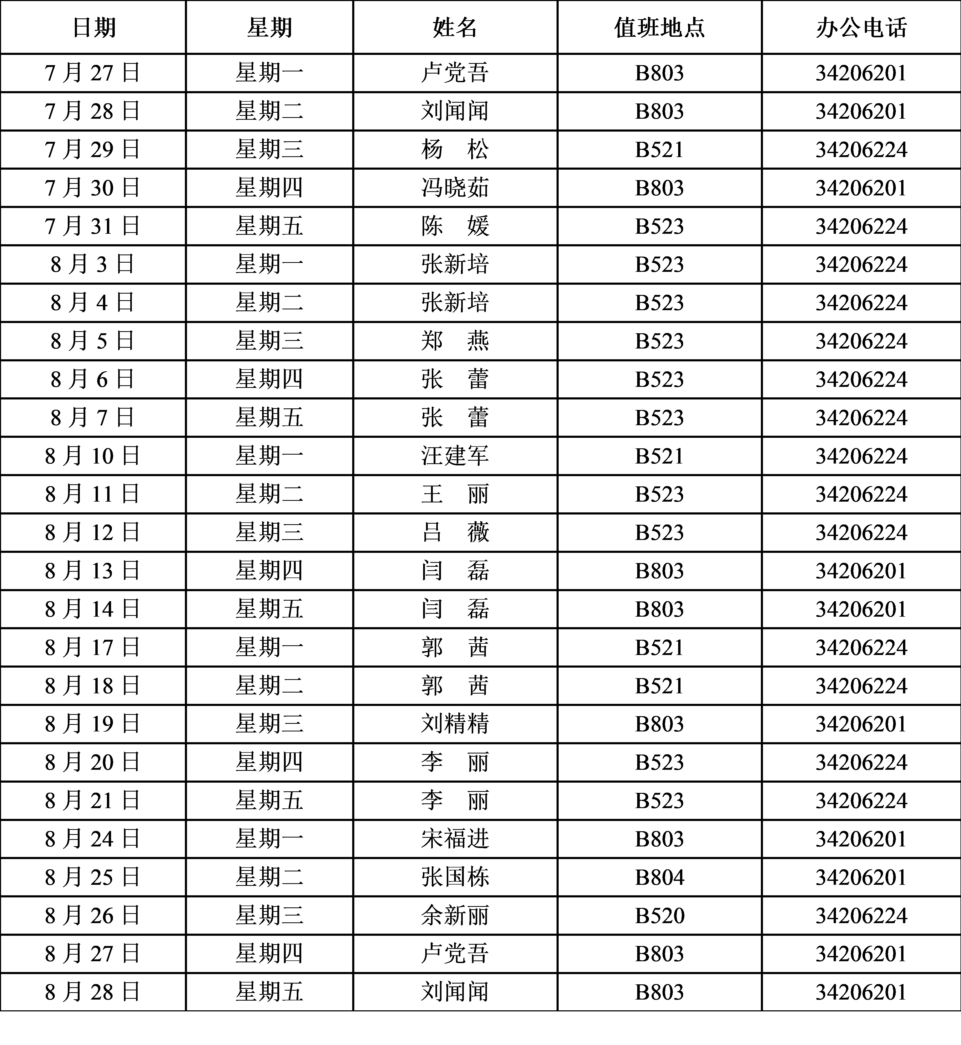 规划处(重点办) 2020年暑假值班表