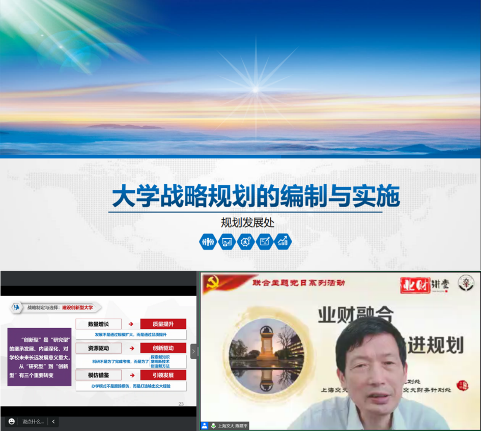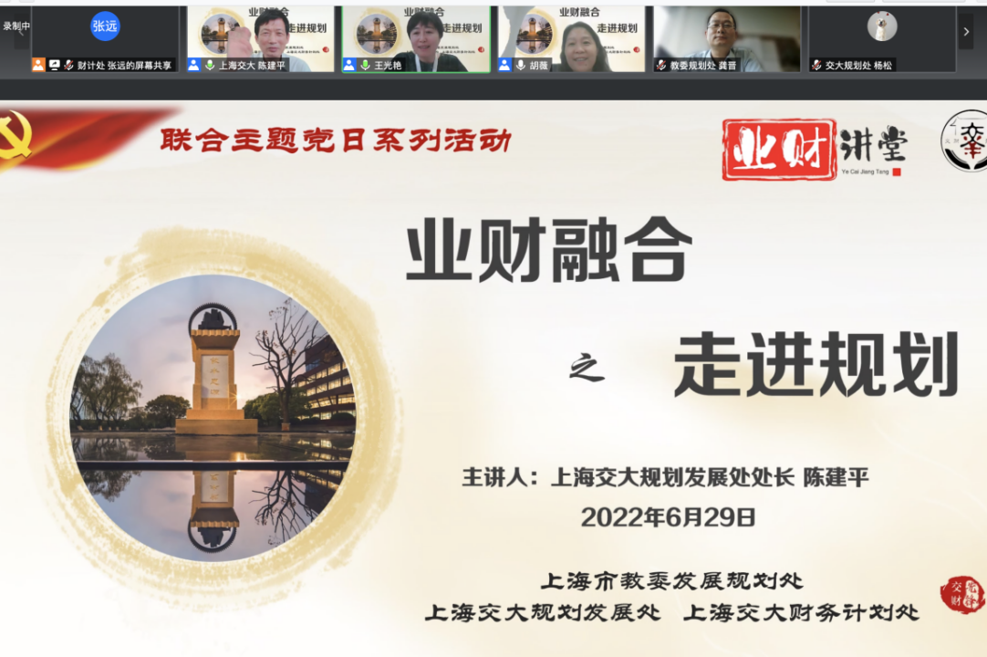 6月29日,上海市教委发展规划处、开云网站世界杯财务计划处、开云足球充值(重点建设办公室、信息化推进办公室)三部门组织线上联合主题党日活动,活动依托业财讲堂,围绕“走进规划”的主题展开,共计200余名党员群众参加活动。会议由开云网站世界杯财务计划处处长王光艳主持。