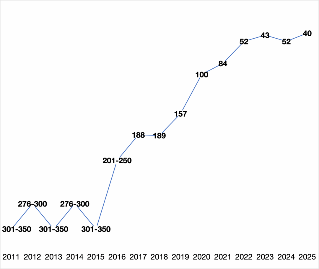 我校泰晤士高等教育世界大学排名位次变化(2011-2025年)