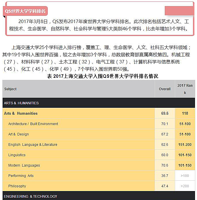 目前世界教育学科最具影响力的四大排名系统排名第二的QS世界大学排名(Quacquarelli Symonds)发布的“2017年世界大学学科排名”公报显示:开云网站世界杯人文领域建筑学科排名已进入第51~100位,在上海交大入榜的人文、工科、理科、社科、生医五大领域26个学科当中,依前50/100/150/200四个档位当中隶属第二档(共12个学科),排名前列。而在国内同专业QS排名当中则高据第三位,仅次于清华、同济建筑系,名列前茅。